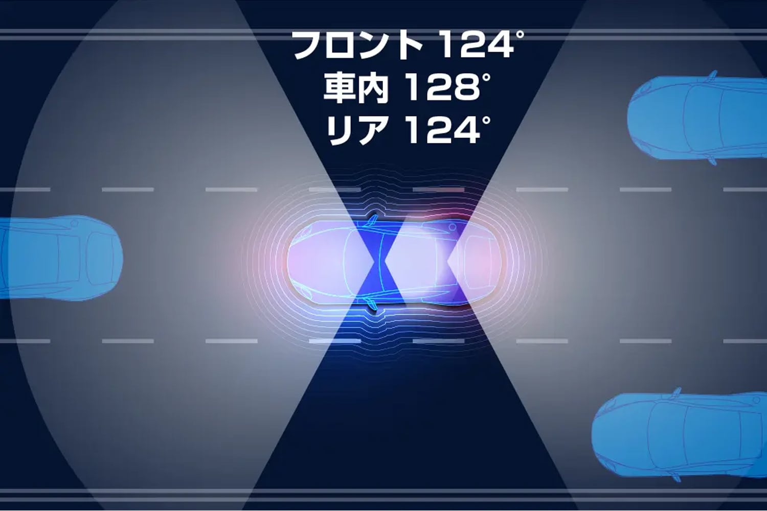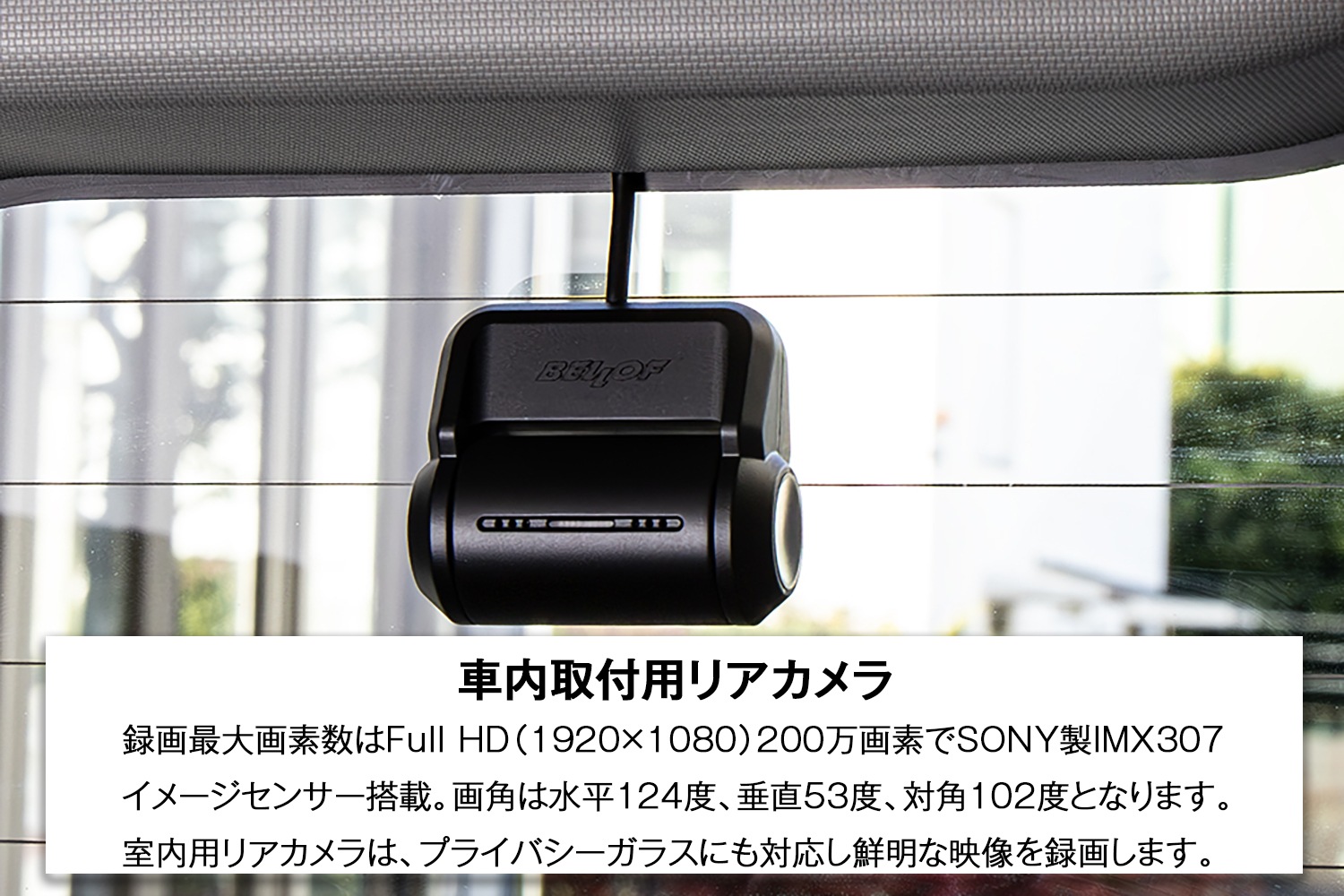 カメラはフロントに2つのカメラを装備し、リアと合わせて3つのカメラで前方・後方・車内を記録します。